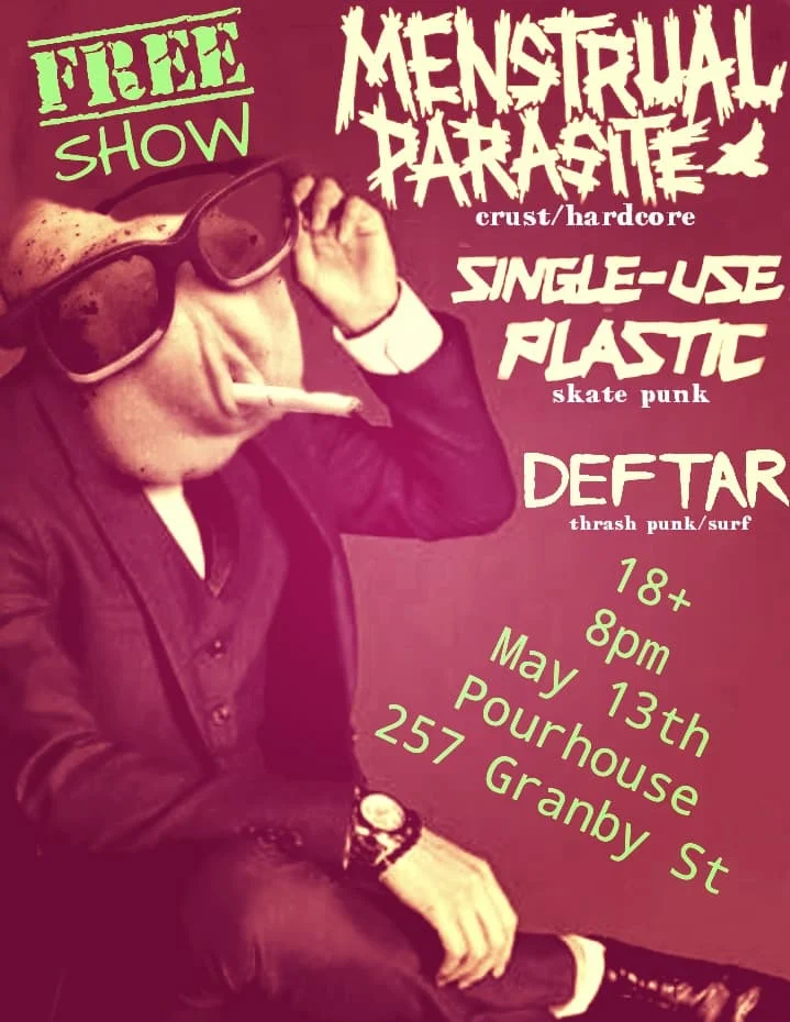 One of the sickest,brutal bands to come out of Roanoke,MENSTRUAL PARASITE tears it up with their basement hardcore/crust noise.Along with the best skate punk band in town, SINGLE USE PLASTIC.Their new album is sick,check it out.Former Opium frontman,James Dickerson is playing his first show with his new thrash/surf punk band DEFTAR.Its good shit so keep on the lookout.