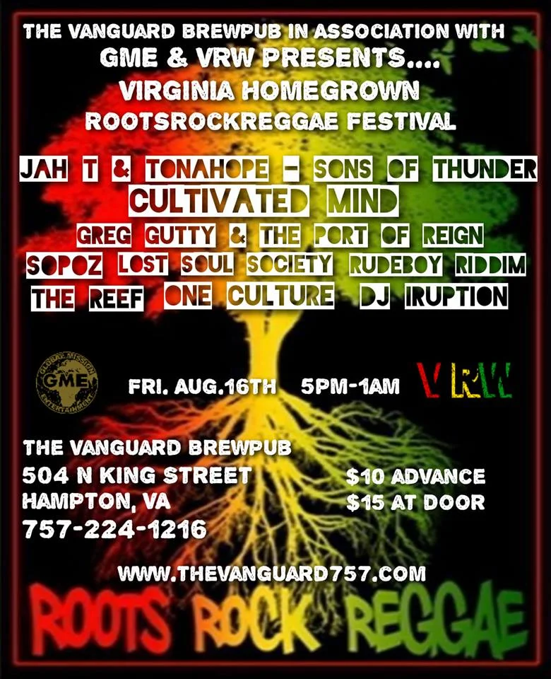 Culmination of Virginia's Finest Reggae Musicians. Performing in one perfect setting, with sounds coming from Jah T and Hopeton from Sons of Thunder. Also performing Lost Soul Society, Greg Gutty and the Port of Reign, Sopoz, Rudeboy Riddim, Cultivated Mind, Trevor Daniels and the Reef and One Culture alongside DJ Iruption on the turntables. Come out an show support for our own Reggae musicians. ❤💛💚 💯