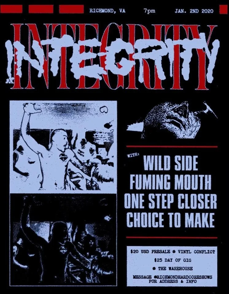 INTEGRITY have been celebrating the end of the world since 1988 and 31 years later it's a pleasure to have them back in RVA in their first non-festival appearance in our memory at THE WAREHOUSE (ask a punk)! SLIMEHOLE has teamed up with ACE ALPHA for this one to bring a killer mixed opening bill from all over the punk/metal/hardcore spectrum! FUMING MOUTH will be bringing their metallic mosh destruction from Boston and showcasing material from their TRIPLE B RECORDS LP, "The Grand Descent." Speaking BBB, Niagara Falls, Canada crew and self-proclaimed "baddest band on the planet," WILD SIDE will also be a featured act on the bill as well as a third BBB act, Wilkes Barre XXX emotive hardcore punks ONE STEP CLOSER and Scranton area young bucks CHOICE TO MAKE! Hit up @richmondhardcoreshows on IG for details on advance tickets and location and thanks for supporting Richmond underground metal and punk!