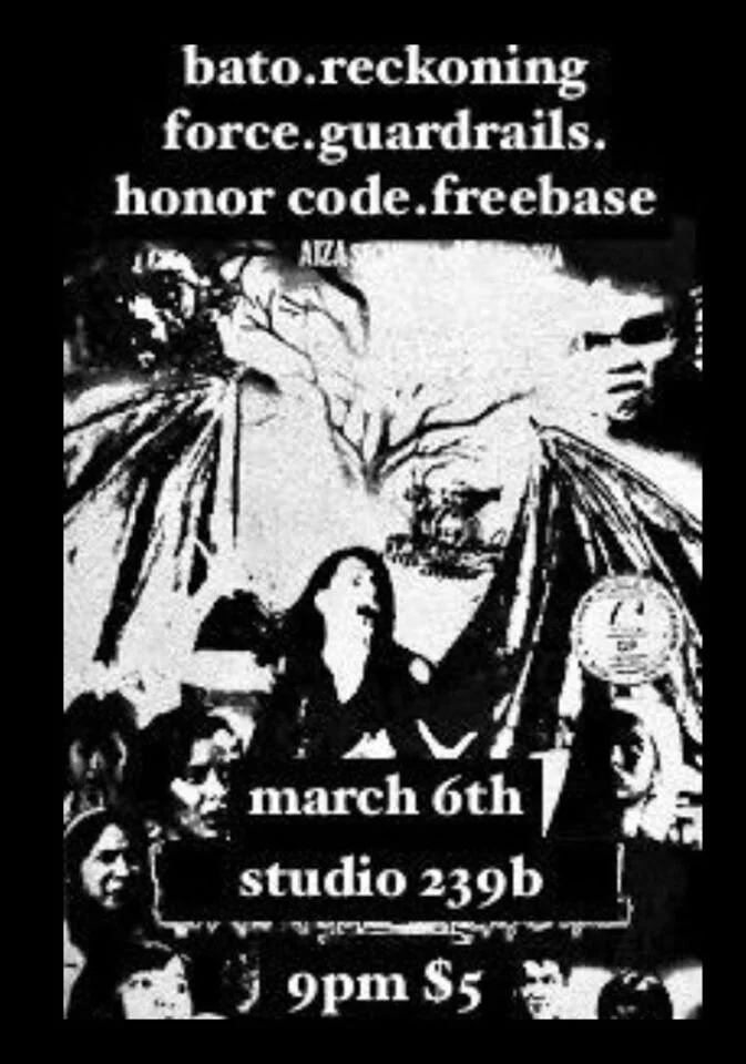 Studio 239b presents the first of four shows happening at the studio during the month of March. HONOR CODE and FREEBASE will be kicking things off. GUARDRAILS will be making the trip down from Richmond, fresh off a debut demo. BATO & RECKONING FORCE will be providing that sweet and savory NFTW flavour to round out the night.